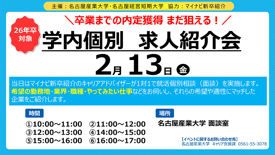 名古屋産業大学キャリア支援課では就職支援の一環として、「学内個別 求人紹介会」を開催しました。