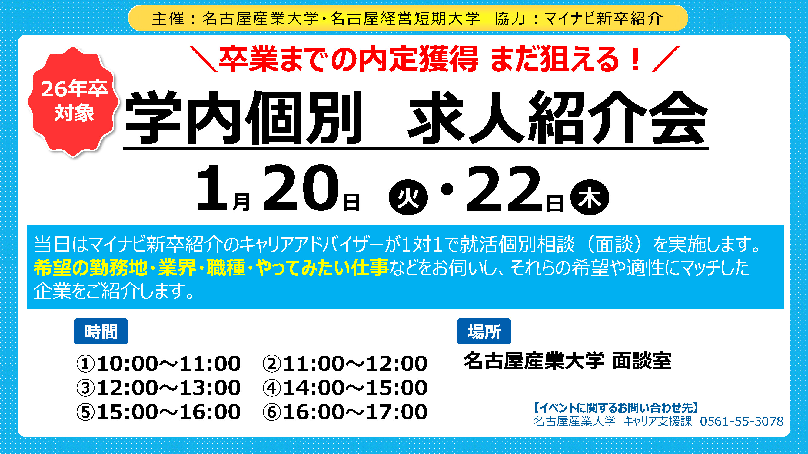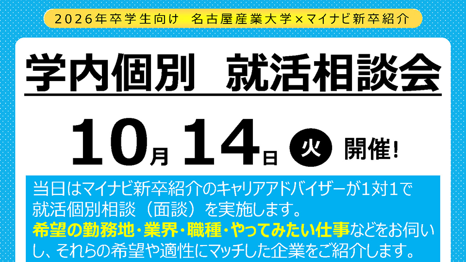 名古屋産業大学キャリア支援課では就職支援の一環として、「学内個別 求人紹介会」を開催しました。